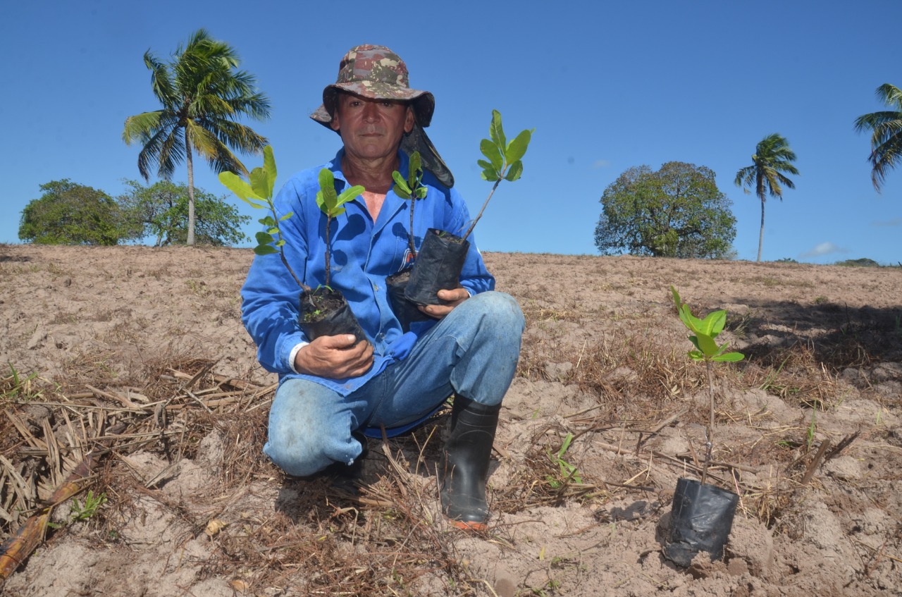 O fortalecimento da cajucultura vem sendo feito com recursos próprios do município, junto com a EMATER? que fornece assistência técnica aos beneficiários. Nessa primeira etapa, oito produtores foram beneficiados com as mudas entregues. Um deles é o seu Gabriel Rêgo, 55, morador de Olho D’agua do Chapéu.