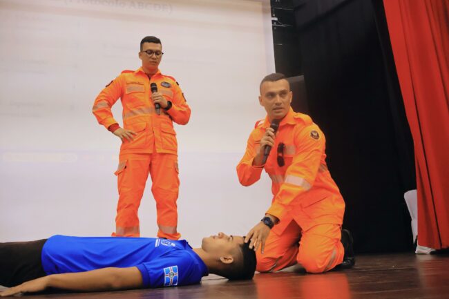 O treinamento foi conduzido pelos soldados Marques e Costa, com foco em Atendimento Pré-Hospitalar (APH) e primeiros socorros. Durante a capacitação, os participantes acompanharam demonstrações práticas de como agir em situações de emergência até a chegada do socorro especializado.