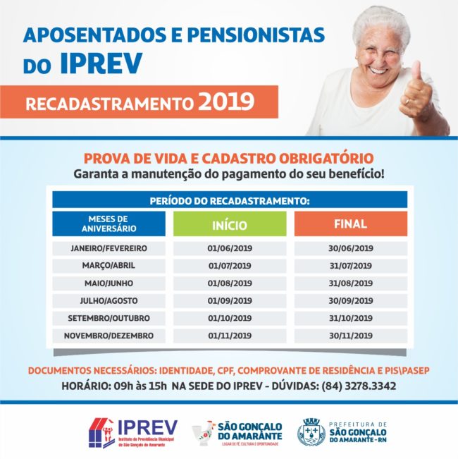 As datas de comparecimento variam de acordo com a data de nascimento do beneficiário. Para fazer a prova de vida, isto é, para comprovar que estão vivos, os segurados devem comparecer à sede do Iprev, localizada na Rua Pastor Cícero Hipólito da Rocha, 23, em Santa Terezinha, portando os seguintes documentos: Identidade, CPF, comprovante de residência e PIS/PASEP.