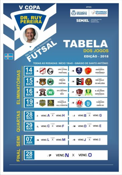 A 5ª edição da Copa Dr. Ruy Pereira de Futsal começa nesta quarta-feira (14), com participação das 16 melhores equipes ranqueadas no Campeonato Municipal de São Gonçalo do Amarante em 2017.