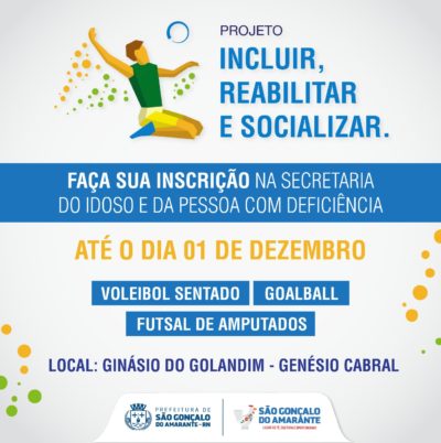 Estão abertas as inscrições para o "Incluir, reabilitar e socializar através do esporte", que visa desenvolver atividades esportivas adaptadas com o objetivo de incluir, no convívio social, as pessoas portadoras de necessidades especiais do município de São Gonçalo do Amarante.