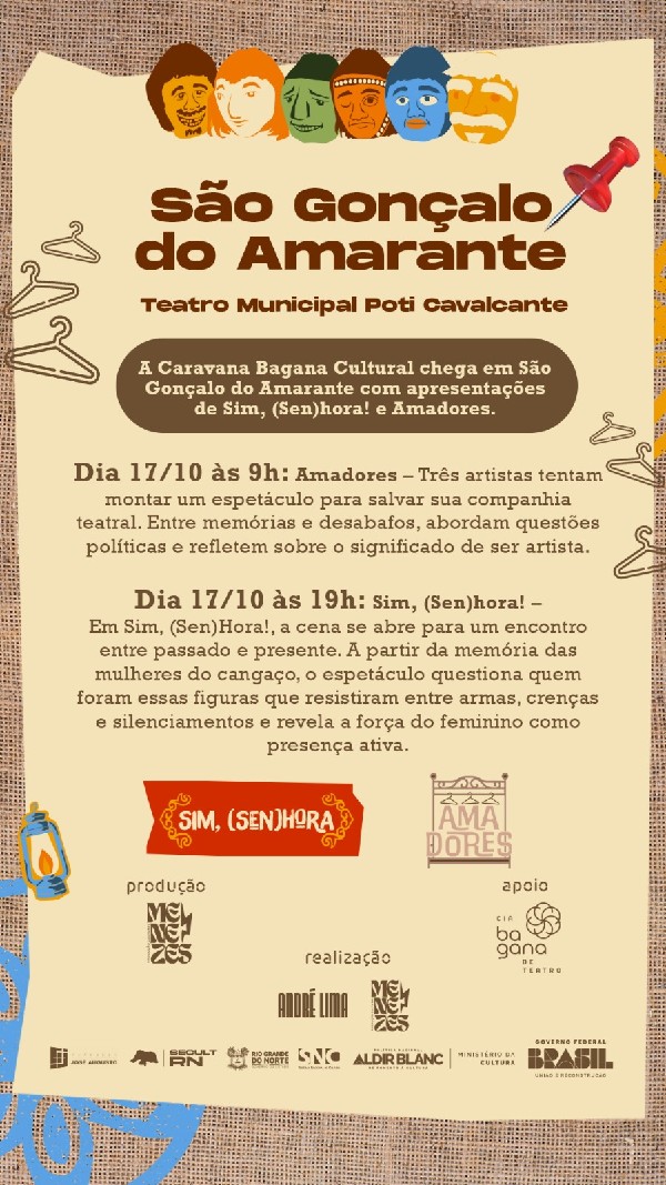 São Gonçalo do Amarante vai receber um grande momento cultural com a chegada da Caravana Bagana Cultural, que apresenta, nesta sexta-feira, 17 de outubro, duas montagens teatrais imperdíveis: Amadores e Sim, (Sen)hora!. As apresentações acontecem no Teatro Municipal Poti Cavalcante, em horários distintos, proporcionando ao público experiências únicas de reflexão, memória e arte.