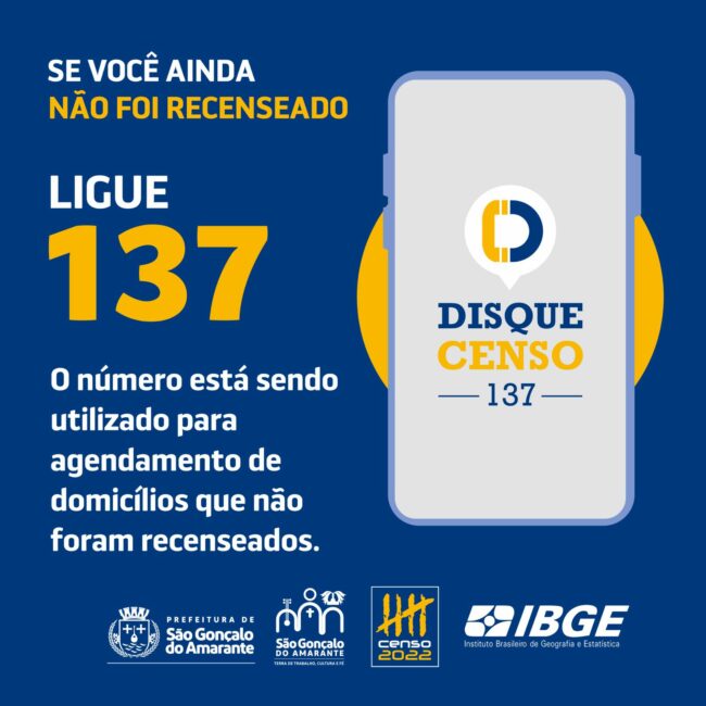 A população que ainda não foi recenseada poderá ligar para o número 137 e agendar sua entrevista. A ligação é gratuita e ficará disponível até janeiro de 2023. Trata-se de mais um instrumento utilizado pelo Instituto Brasileiro de Geografia e Estatística (IBGE) para garantir a melhor cobertura e não deixar ninguém de fora do Censo Demográfico 2022.