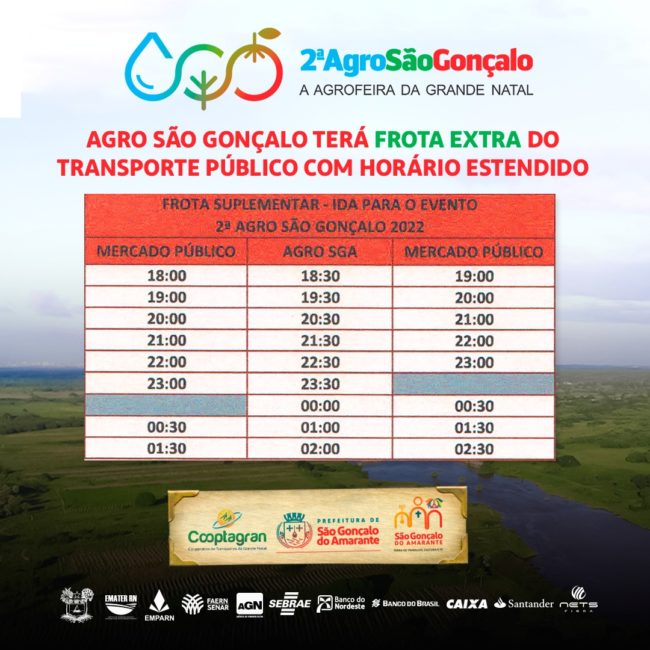 Atendendo uma solicitação da Prefeitura de São Gonçalo do Amarante/RN, através do Departamento Municipal de Trânsito (Demutran), a Cooperativa de Transportes da Grande Natal (Cooptagran) irá disponibilizar uma frota suplementar e com horário estendido nos dias 25, 26 e 27 (quinta, sexta e sábado), durante a 2ª Agro São Gonçalo.