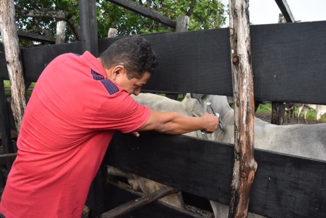 Criadores da comunidade de Jenipapo receberam, nesta quinta-feira (2), a equipe de vacinadores da Secretaria Municipal de Agropecuária e Desenvolvimento Agrário de São Gonçalo do Amarante (Semada) que está desenvolvendo a primeira etapa da campanha de vacinação contra a febre aftosa e oferecendo, gratuitamente, as doses para imunizar o rebanho.