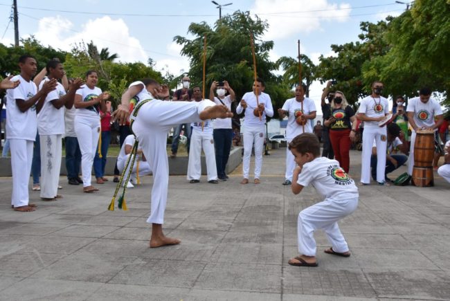 Do museu, o cortejo partiu para a Igreja Matriz de São Gonçalo, no Centro, com o Pe. André. Na praça Sen. Dinarte Mariz, o grupo de capoeira Salve Zumbi, já estava a postos com toda sua expressão cultural para encerrar o quarto momento do dia.