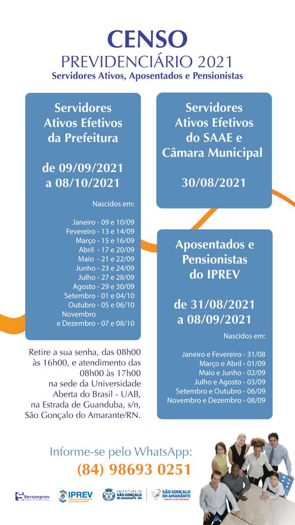 Conforme o decreto, o período para o recadastramento vai do dia 30 de agosto até o dia 8 de outubro de 2021, com distribuição de senhas das 08h às 16h e atendimento das 8h às 17h, no prédio sede da UAB Universidade Aberta do Brasil (Polo Universitário São Gonçalo do Amarante/RN Dr. Ruy Pereira dos Santos), localizado na Estrada de Guanduba, s/n, São Gonçalo do Amarante/RN, conforme cronograma abaixo: