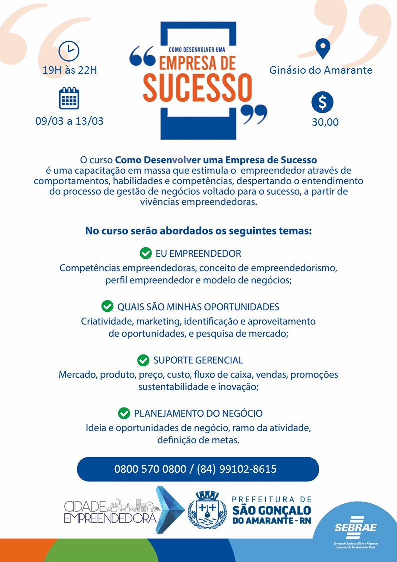 A Prefeitura de São Gonçalo do Amarante/RN, por meio da Secretaria Municipal de Desenvolvimento Econômico e Turismo (Semdet), juntamente com Serviço Brasileiro de Apoio às Micro e Pequenas Empresas (Sebrae), realiza, de 09 a 13 de março, o curso "Como Desenvolver uma Empresa de Sucesso".