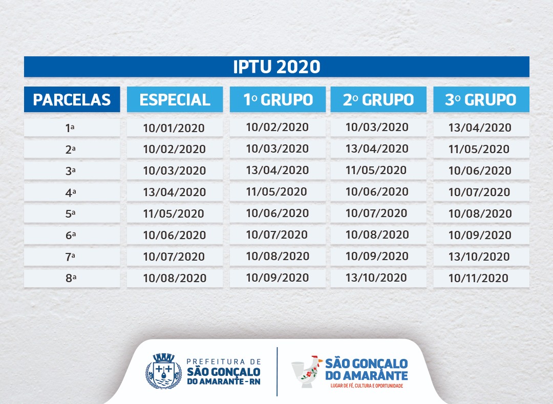 A Prefeitura de São Gonçalo do Amarante, por meio da Secretaria Municipal de Tributação (SMT) divulgou o calendário de pagamento do IPTU 2020. O contribuinte pode realizar o pagamento em cota única, com descontos de até 20%, ou parcelado em até oito vezes, respeitando o limite mínimo de R$ 30 por parcela.
