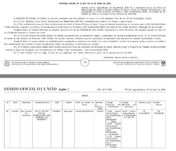 São Gonçalo do Amarante acaba de alcançar um importante avanço na área da saúde pública. O Ministério da Saúde publicou, no Diário Oficial da União desta segunda-feira (13), a portaria que habilita o Centro Especializado em Reabilitação (CER) do município como CER III, ampliando a capacidade de atendimento e assegurando novos recursos federais para manutenção dos serviços.